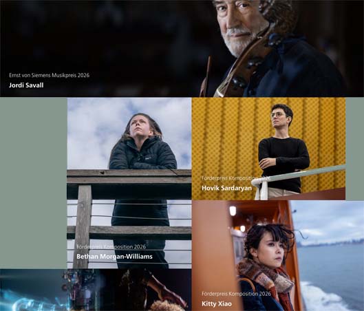 Der Ernst von Siemens Musikpreis 2026 geht an den Musiker Jordi Savall aus Katalonien, Spanien. Die Auszeichnung für ein Leben im Dienste der Musik ist mit 250.000 Euro dotiert. Die Preisverleihung findet am 23. Mai 2026 im Prinzregententheater in München statt. Die Förderpreise Komposition mit je 35.000 Euro werden 2026 der britischen Komponistin Bethan Morgan-Williams, Hovik Sardaryan aus Armenien und der australischen Komponistin Kitty Xiao verliehen. Die Ernst von Siemens Musikstiftung erhöht 2026 erneut das Fördervolumen und vergibt insgesamt 4,3 Millionen Euro. – Morgan-Williams (*1992) lebt zurückgezogen in Wales. Der Gegensatz zwischen ruraler Ruhe und urbaner Reizüberflutung ist Ausgangspunkt ihrer Werke, die mehrschichtig und rhythmisch komplex angelegt sind und die die Hörer:innen stets durch verschiedene Landschaften zu führen scheint. In den Werken von Hovik Sardaryan, 1993 in Armenien geboren, Werken finden sich wiederholt Anklänge an seine armenische Heimat, darunter traditionelle Instrumente und Volksweisen; außerdem beschäftigt er sich mit ungewöhnlichen Stimmungen und Mikrotonalität. Die Arbeit der 1989 in Australien geborenen Komponistin, Klangkünstlerin und Produzentin Kitty Xiao ist stark von der Auseinandersetzung mit dem menschlichen Körper und seinem Erfahrungsraum geprägt; viele ihrer Werke haben Performance-Charakter. Die Beschäftigung mit elektronischen Speichermedien steht im Mittelpunkt ihres musikalischen Denkens. (Fotos Preisträger:innen: © Rui Camilo)