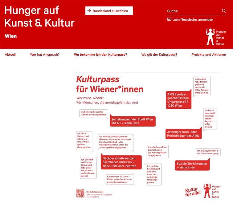 Ihren Hunger auf Kunst und Kultur können in Österreich Menschen stillen, die in prekären finanziellen Verhältnissen leben. Sie haben Anspruch auf den Kulturpass. Mit dem Kulturpass kann man alle Kultureinrichtungen/-häuser/veranstalter besuchen, die Partner der Aktion Hunger auf Kunst und Kultur sind.